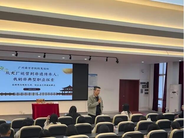 2025年11月21日,广州南方学院第13期校友论坛在6教106举行,我校2023届文化产业管理专业校友、广府谢家非遗制香技艺第六代传承人南卿云,以“从大厂运营到非遗传承人”为主题,分享了其独特的职业探索经历,为同学们传输了宝贵的职业成长经验。公共管理学院文化产业管理专业负责人、副教授周先捷老师,专升本学生第一党支部书记姚凡老师,人力资源管理系郭琦老师,辅导员王煦老师出席活动。