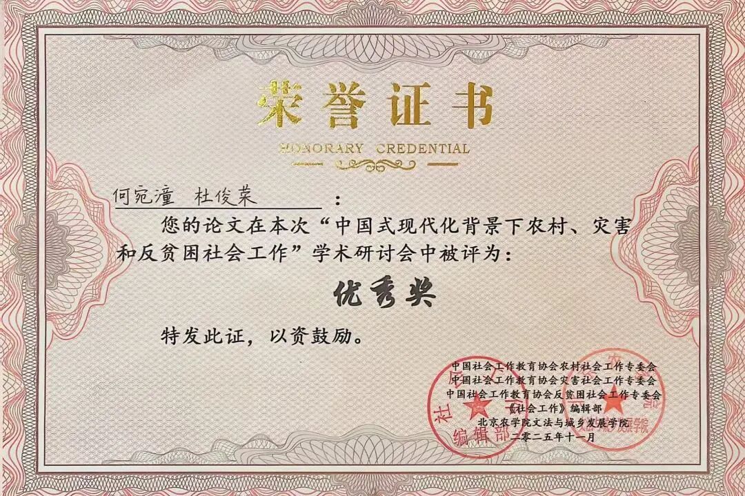 公共管理学院杜俊荣老师携学生何宛潼的入选论文在本次会议中荣获优秀奖。