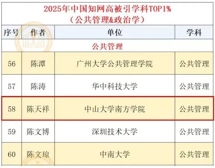 近日,CNKI中国知网正式发布“2025全国高被引学者”名单,我校共有四位老师凭借各自领域的突出实力成功入选,其中公共管理学院的陈天祥老师(公共管理)跻身“2025全国高被引学者TOP1%”行列,公共管理学院的王翔老师(公共管理)、王政老师(信息资源管理)以及图书馆的梁荣贤老师(信息资源管理)跻身“2025全国高被引学者TOP5%”行列。