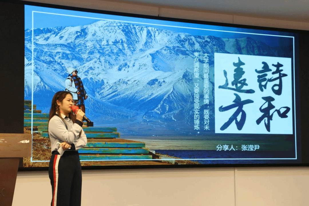 广州南方学院公共管理学院人力资源管理专业2018届毕业生张滢尹师姐,向在校大学生分享了其在学习和工作中对诗与远方的追寻。她希望学弟学妹们在大学时光里,既怀揣对诗和远方的向往,勇敢憧憬未来,又能脚踏实地,在现实探索中磨砺自我,于憧憬与现实的交织中,书写成长篇章,收获蜕变与力量。
