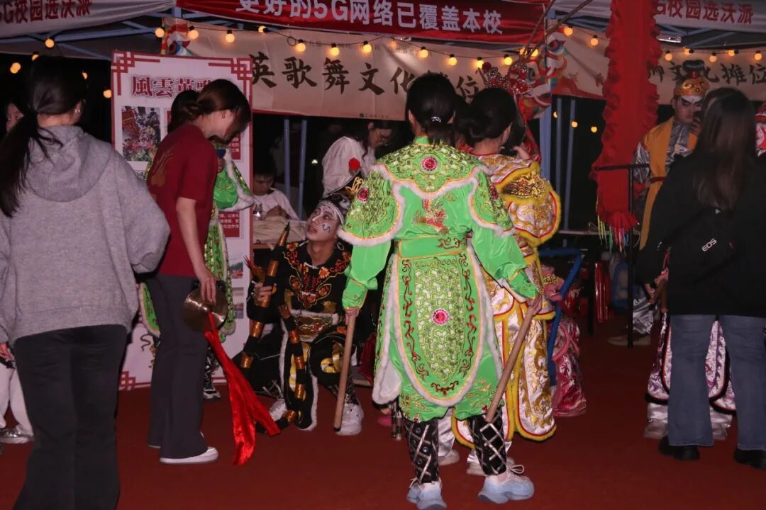 英歌舞社团成员头戴脸谱、身着彩衣,踏着刚劲有力的步伐起舞,铿锵的锣鼓声与整齐的动作相得益彰,展现出国家级非遗的磅礴气势,不少同学驻足拍摄,记录下这极具冲击力的瞬间。