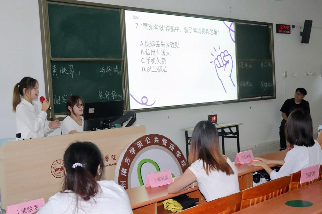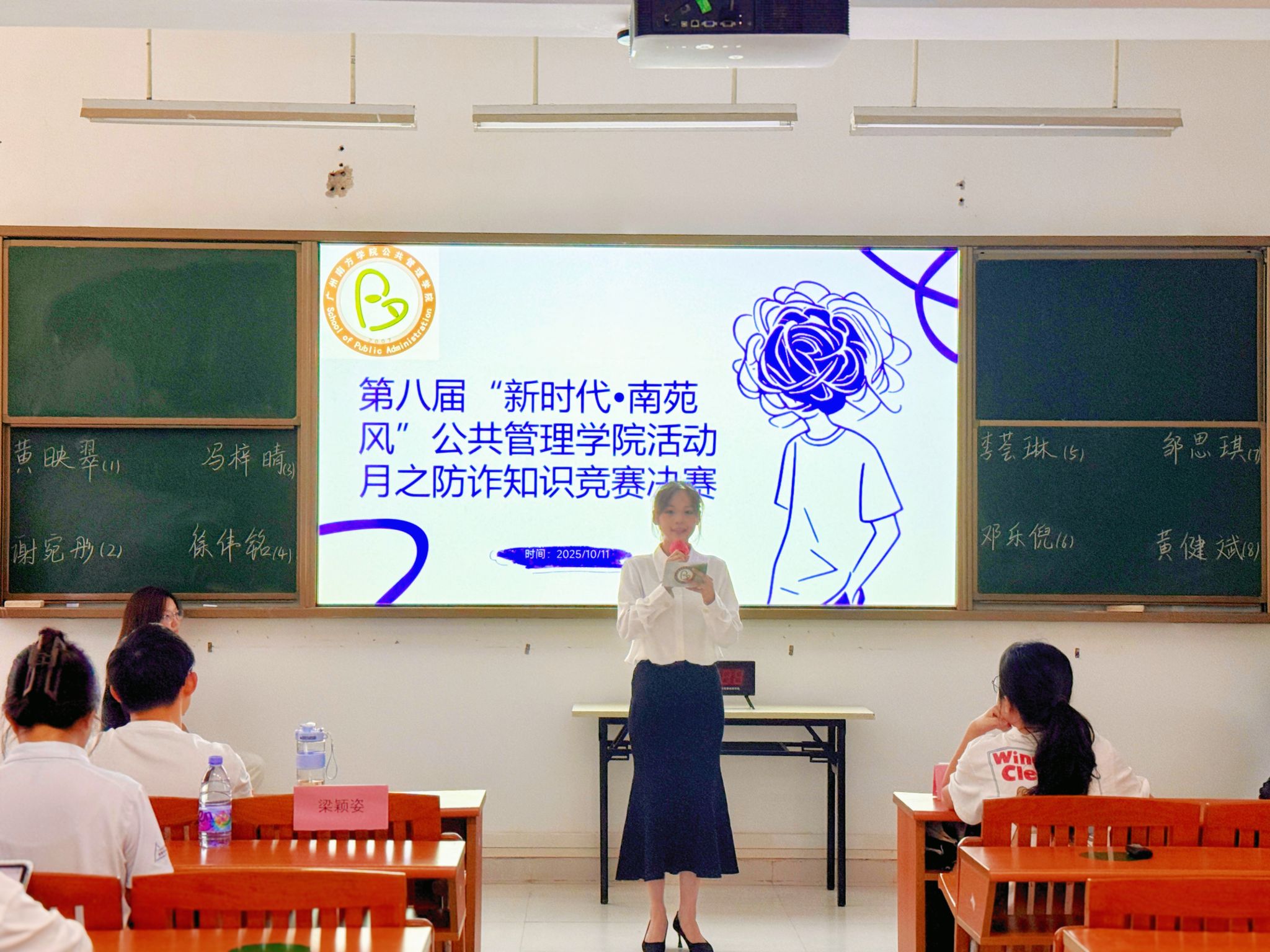 2025年10月11日,广州南方学院第八届“新时代•南苑风“公共管理学院活动月之“防范于心,反诈于行”安全教育知识竞赛决赛在7教104顺利开启,一场关于智慧的比拼就此启航。