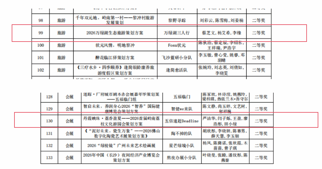 全国二等奖:蔡芝文、杨艾希、李缘的项目《2026万绿湖生态旅游策划方案》与严洁华、闫子烁、王盈、廖浩彤、田小绿的项目《丹霞映珠·荔香盈夏——2026 首届岭南荔枝文化游园会策划方案》