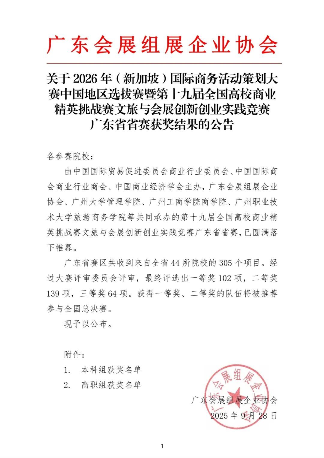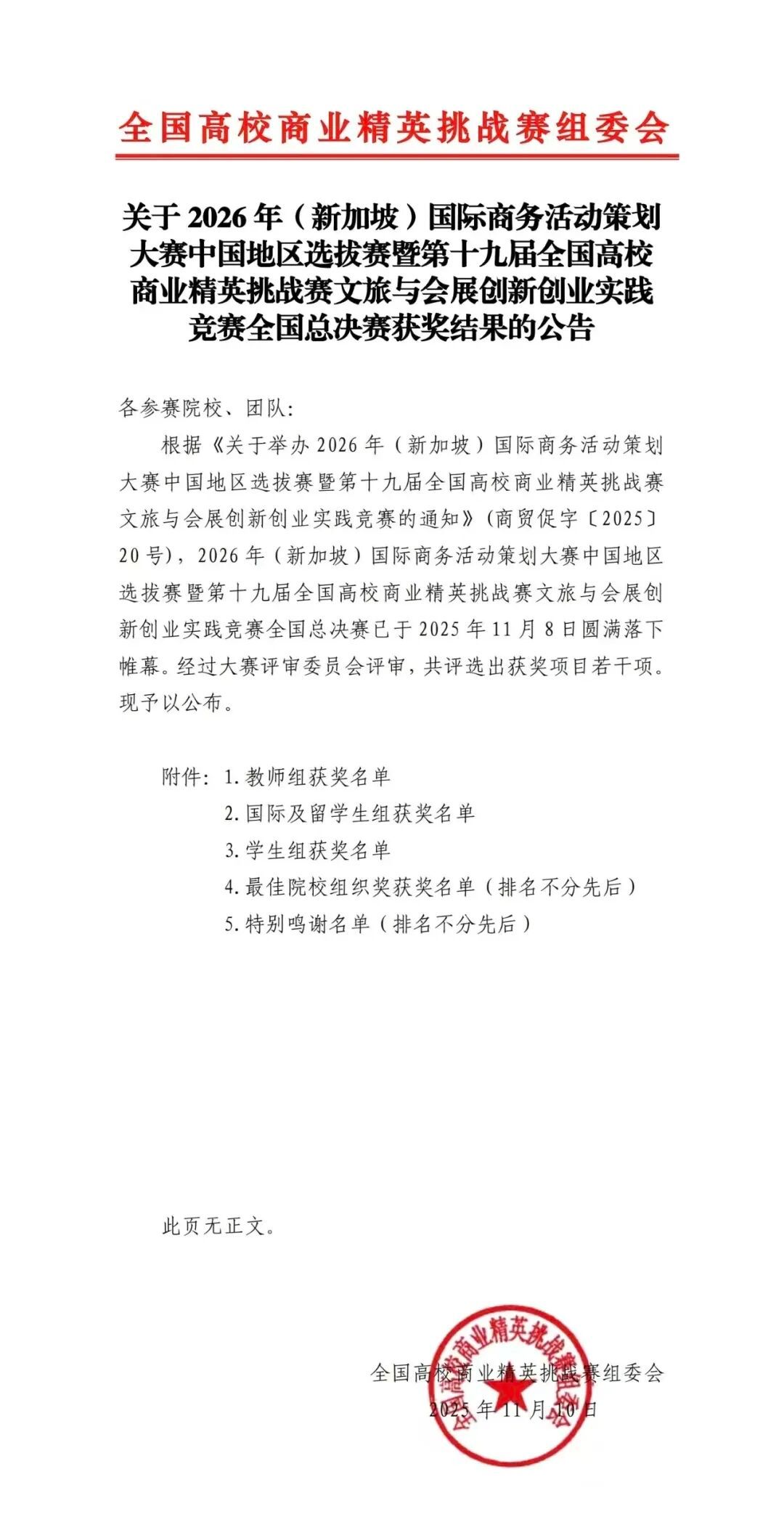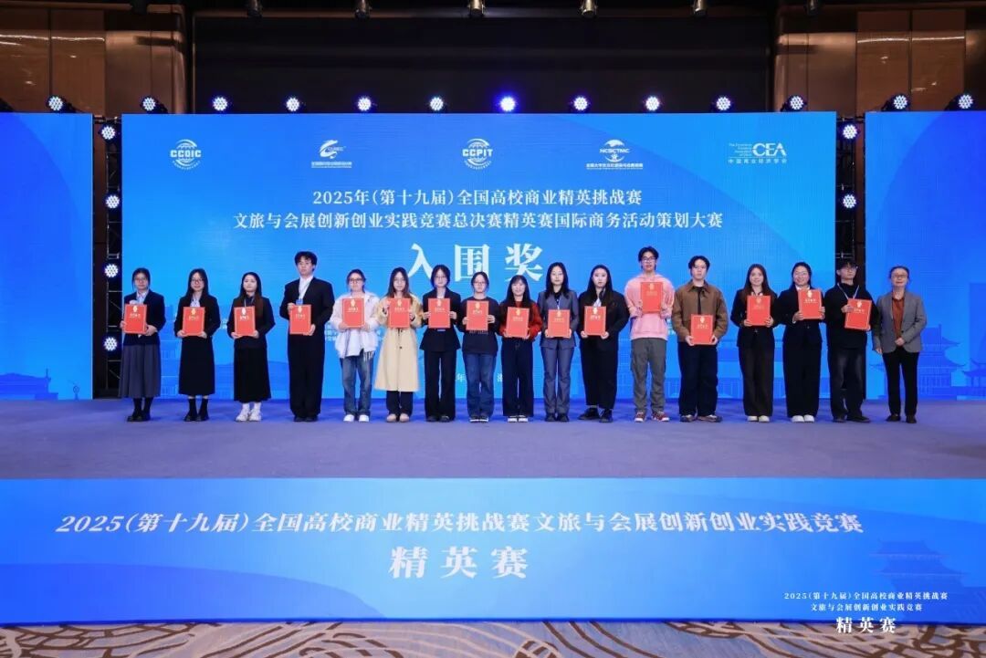 从省赛突围到国赛摘金,再到精英赛亮相,每一步都是优中选优的淬炼。此次比赛取得的优异成绩,不仅是我校在深化创新创业教育改革、注重学生实践能力培养方面取得的又一佳绩,更是我校高素质应用型人才培养成效的生动体现。展望未来,我院将坚守“以赛促教、以赛促学”的初心,着力提升学生的综合素质与实践能力,推动文旅与会展领域人才培养再上新台阶。我们将以竞赛为窗口,持续扩大其在高校与社会中的积极影响。