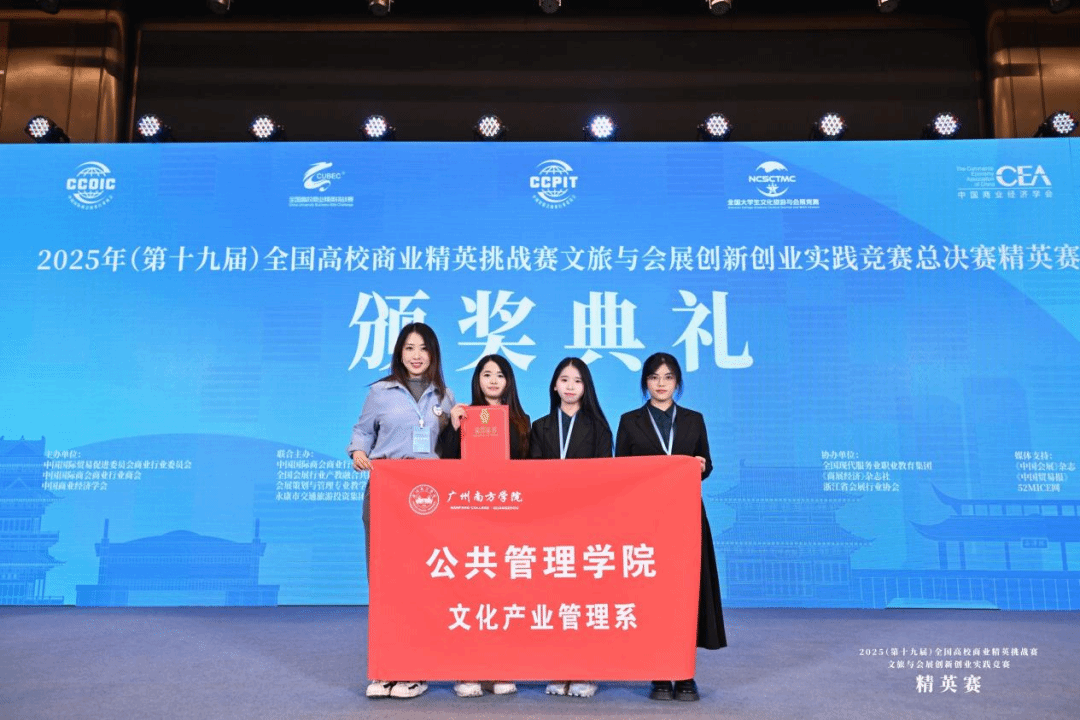 作为本赛事的最高级别竞赛,全国总决赛精英赛汇聚了从全国分组赛中脱颖而出的顶尖团队。我院由队长李咏欣、成员黄映灵、黄金怡组成的“岭南泉韵,从化之声”项目组,以会展项目策划赛道全国50强及我校唯一代表队的身份,赴浙江永康参与角逐,最终荣获精英赛入围奖,展现了南院学子的卓越风采。