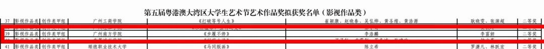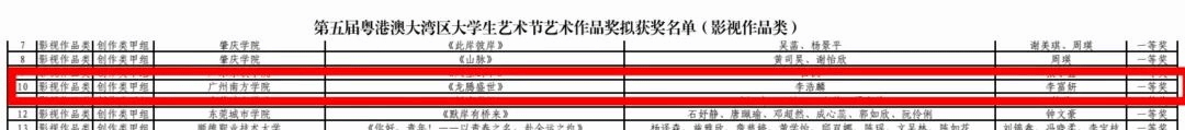 近日第五届粤港澳大湾区大学生艺术节拟获奖名单公布。经省教育厅组织专家评审,公共管理学院文化产业管理专业2大类共2项作品脱颖而出,获得影视作品组一等奖1项、二等奖1项;文化产业管理专业李富妍老师荣评“优秀指导老师”称号。