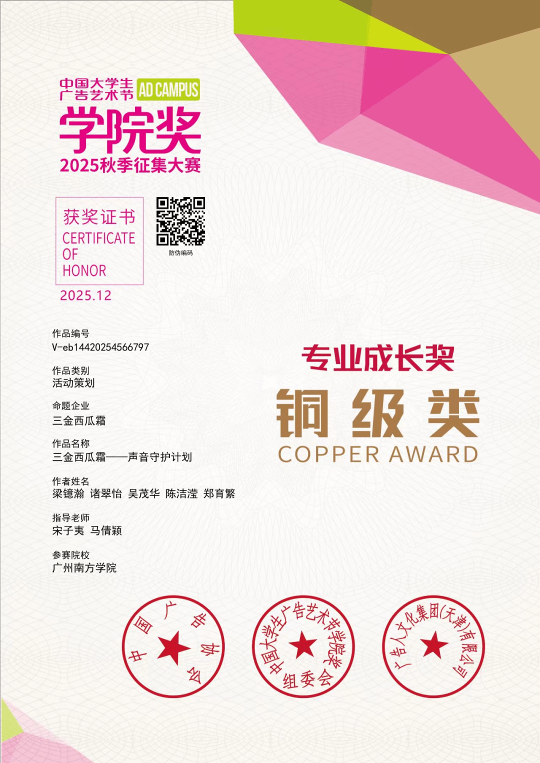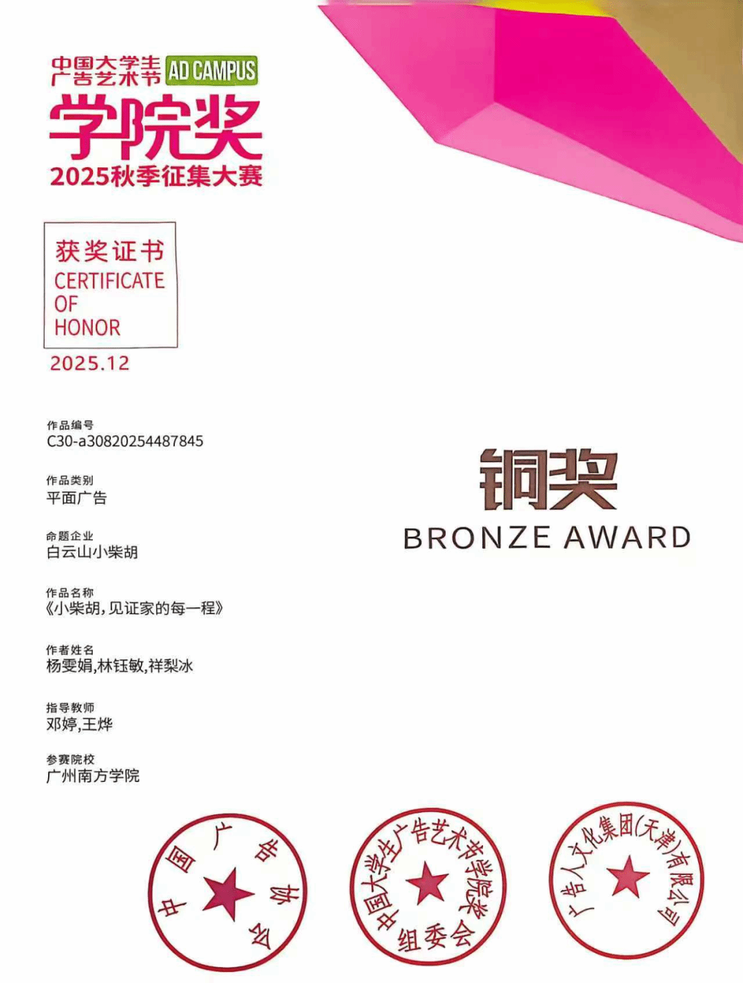 本次学院奖,广州南方学院公共管理学院共斩获铜奖 2 项、优秀奖 4 项、入围奖 11 项。每一份荣誉的背后,是学子们日夜打磨的创意付出,是指导老师们悉心指导的专业引领,更是学院深耕广告创意教育、践行应用型人才培养理念的生动体现。