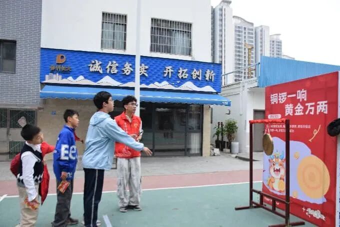 "哐——"随着清脆的锣声响起,"铜锣一响"摊位前爆发出阵阵欢呼。参与者通过投掷钱币串敲响铜锣,寓意新年财源广进、开门红运。简单的互动设计让老人、孩子都乐在其中。