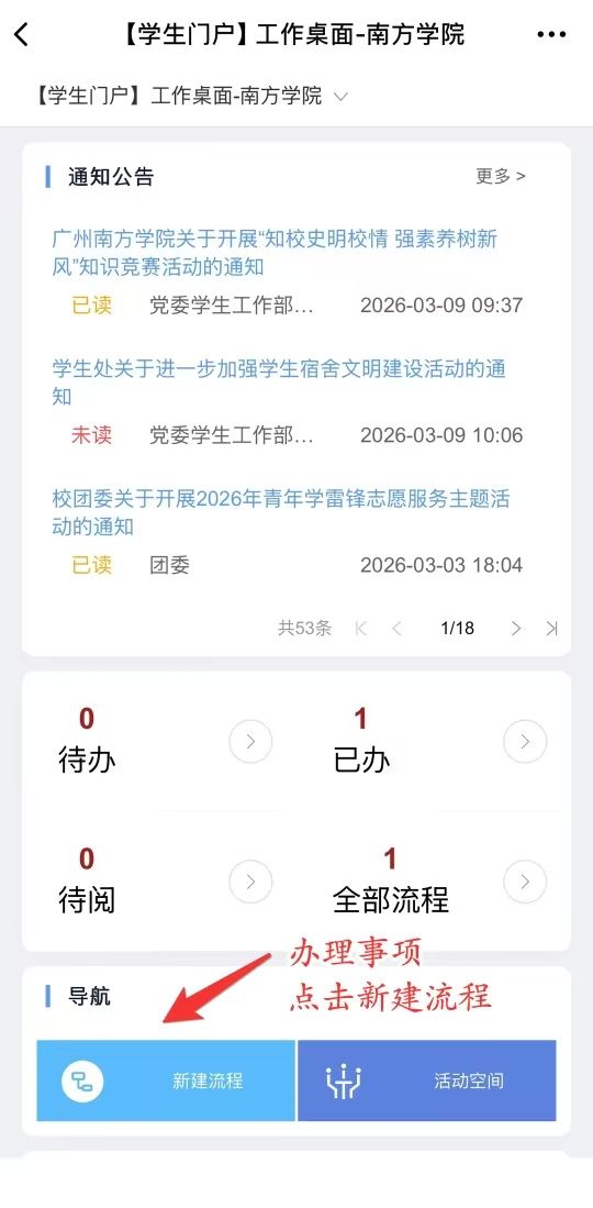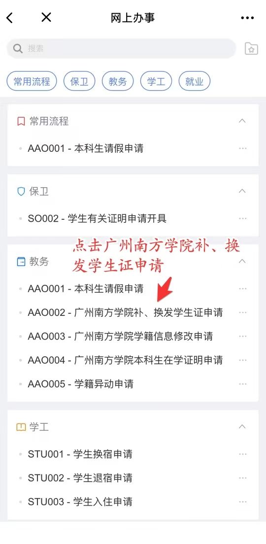 打开企业微信→点击工作台→点击办事大厅(学生)→点击新建流程→点击广州南方学院补、换发学生证申请→填写相关信息提交→等待申请通过后,携带本人一寸红底或者蓝底证件照到院系办公室办理即可