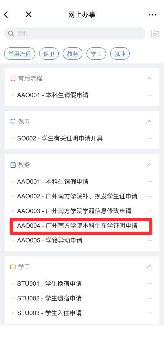 打开企业微信→点击工作台→点击办事大厅(学生)→点击新建流程→选择广州南方学院本科生在学证明申请→填写相关信息即可(办理其他事项流程同理)