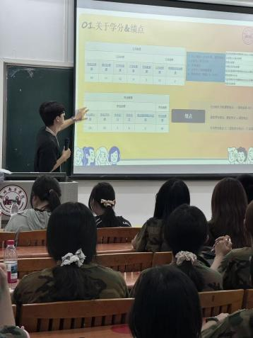 班会现场氛围热烈有序,作为新生认知大学管理体系的“第一窗口”,内容围绕核心议题展开:“成长学时”与综测环节,朋辈辅导员详解其构成、获取途径与认定标准,明确学术讲座、社会实践等场景的学时积累方式,引导新生规划课余时间;校园安全教育则以案例分析、互动提问形式,围绕消防、用电、人身及网络安全展开,结合网络诈骗等场景传授防范技巧,强化新生安全意识。