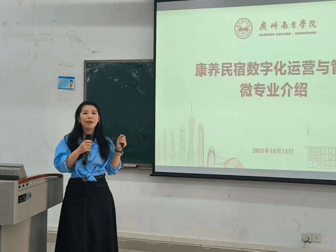 粤空数字化传播与运营产业学院常务副院长、文化产业管理专业专任教师刘佳老师为新生介绍了学校新开设的微专业——康养民宿数字化运营与管理。她指出,该微专业精准瞄准康养文旅这一“黄金赛道”,以“文化传承力+数字技术力+现代运营力”三位一体培养模式塑造专业人才,学生通过学习可掌握民宿规划设计、直播营销策划、康养项目开发等实战技能。此外,微专业实行小班化教学,与多家企业深度合作并提供实地实训机会,毕业后还能推荐至全国优质民宿企业就业。刘佳老师鼓励同学们积极选择该微专业,为自己的未来学习与就业赋能。
