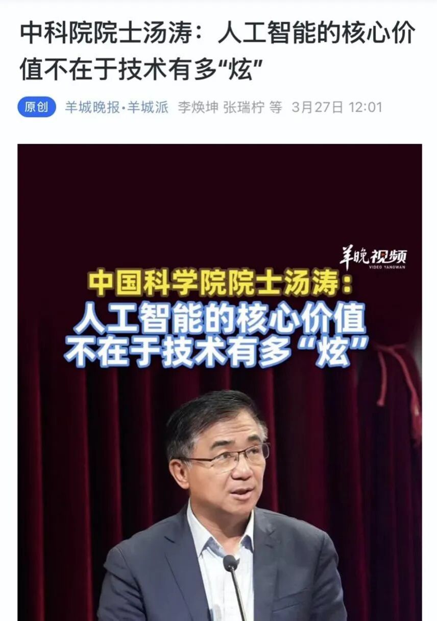 【编者按】2026年3月27日上午,以“AI赋能产业变革、治理创新”为主题的第四届“粤有数”数字化治理交流会在华南农业大学举行。本次活动现场揭晓了15个第四届“粤有数”数字化治理优秀案例,中国科学院院士、广州南方学院校长汤涛和省有关部门领导共同为“广东社会调查基地”揭牌,同步举行了“粤有数AI赋能产业发展平台”成立仪式。原国家信息化专家咨询委员会常务副主任周宏仁为本次活动发来书面寄语,教育部长江学者特聘教授、中山大学社会科学学部主任肖滨、华南农业大学副校长温小波,暨南大学新闻与传播学院前院长范以锦,工信部信息通信经济专家委员会委员、广东省通管局前局长古伟中,广州南方学院公共管理学院院长、广东省粤有数数字化治理专委会联席主席陈天祥等专家学者出席活动,主办、承办、协办单位相关负责人及全省各地市有关部门负责人也到场参会。广州南方学院特聘教授蓝云当选“广东AI金牌讲师”,广州南方学院新技术与政府治理研究中心秘书长黄宁当选“首届高校数据要素大赛”赛道召集人。广州南方学院公管学院副院长史娜等25位教师荣获粤有数长期奉献奖,广州南方学院数字化传播与运营产业学院常务副院长刘佳副教授主持活动。各大主流媒体对活动重点报道,此为系列转载之二。本文3月27日刊载于《羊城晚报》,原题为《中科院院士汤涛:人工智能的核心价值不在于技术有多“炫”》。